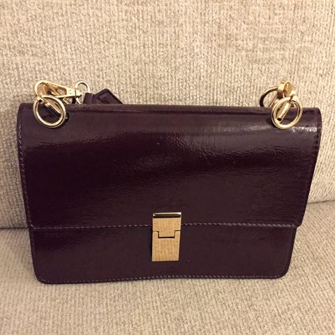 Tasken har en kæderem, som kan aftages, og lynlås. Indvendigt er tasken foret med stof og indeholder et rum til opbevaring.