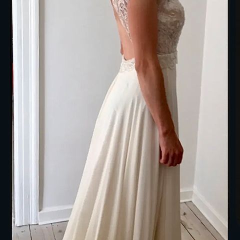 Kjolen passer en str. 36. Jeg er 160 cm høj og bar 8 cm hæle til mit bryllup i august 2025.