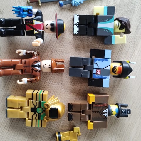 Omkring 25 Roblox figurer med diverse tilbehør, fx sværd, vægtstang osv