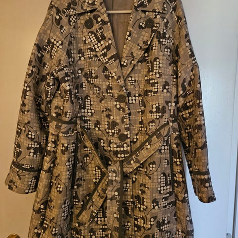 Fransa jakke i størrelse XL til kvinder, i brun ternet mønster. Jakken har knaplukning og to brystlommer med knapper. Materialet fremstår som blødt og varmt, velegnet til køligere vejr.