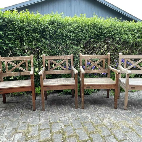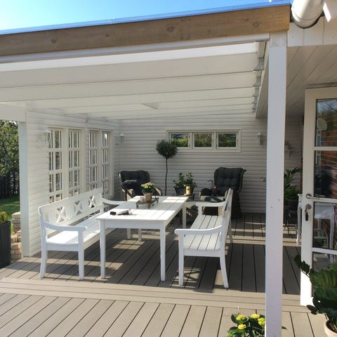 Udendørs TripTrap havemøbelsæt bestående af et hvidt cafebord samt to stole med armlæn. Møblerne er fremstillet i træ med lamelplader og har et klassisk design med krydsdetaljer i ryglænene. Sættet er velegnet til have eller terrassebrug.