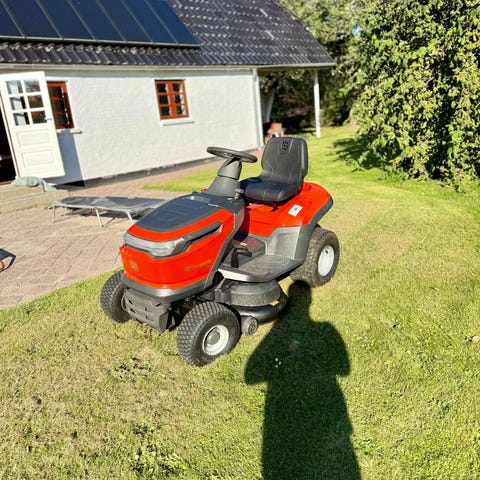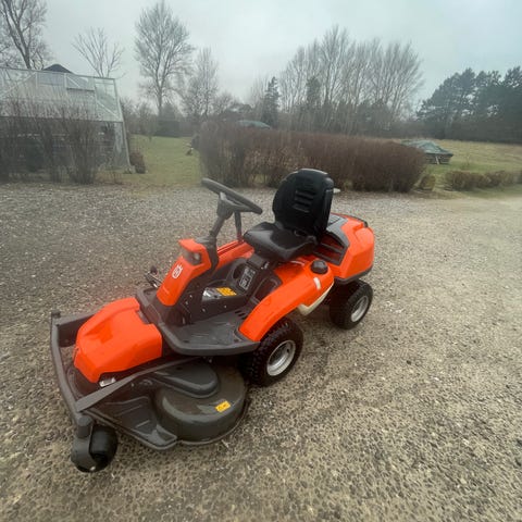 Husqvarna Rider havetraktor i orange og sort farve. Udstyret med en kraftig motor og klippeaggregat til effektiv græsslåning. Sædet er polstret for komfort under brug. Designet til nem betjening med styretøj og pedaler. Velegnet til vedligeholdelse af større græsarealer.
