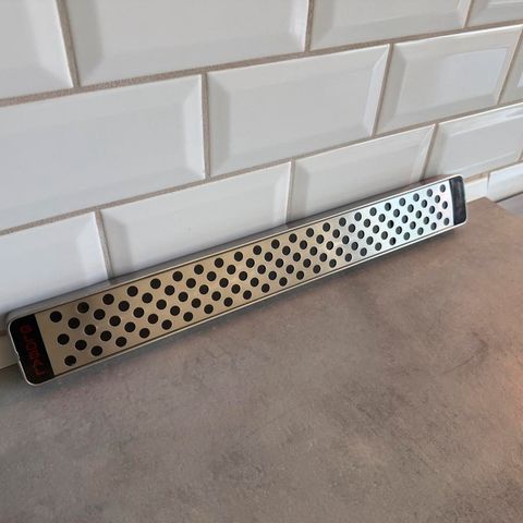 Rustfrit stål magnetisk knivholder fra Global til stilfuld og praktisk opbevaring af dine køkkenknive.