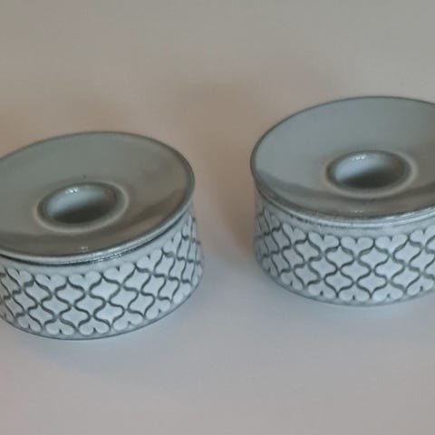 Bing & Grøndahl Hjertegræs lysestager i porcelæn med en dekorativ grøn og beige ring omkring kanten. Lysestagerne har en klassisk rund form og er designet til at holde standard stearinlys. De er velegnede til brug som borddekoration eller til at skabe stemningsfuld belysning i hjemmet.