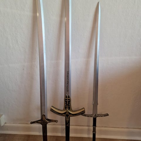 Ukendt dekorativ sværd med mønstret klinge og detaljeret skæfte. Sværdet har en grå farve med ornamentale elementer på klingen og håndtaget. Velegnet til rollespil
