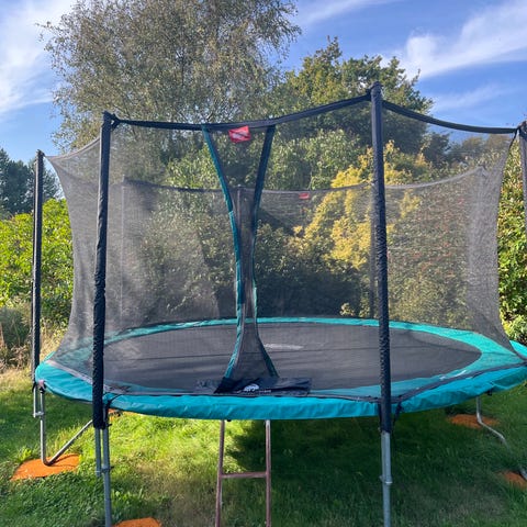 BERG trampolin 330 cm i diameter sælges. Trampolinen er på ben. Deluxe sikkerhedsnet, stige og jordspyd til forankring følger med. Der er to mindre huller i sikkerhedsnettet.