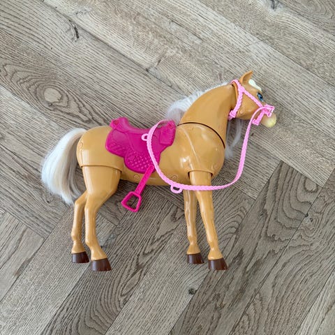 Barbie Hest med pink sadel. Mekanisk, kan gå af sig selv. Hesten har bevægelige led og er udstyret med pink sadel, stigbøjler og benskinner. Egnet til børn som legetøj og samlerobjekt.