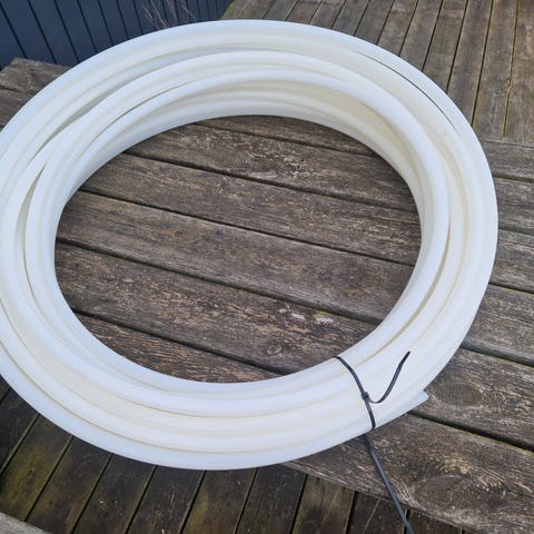 Dansk VVS Import PEX-rør med en diameter på 20 mm. Røret er lavet af hvid plast og er beregnet til brug i VVS-installationer. Materialet er fleksibelt og egnet til transport af vand under tryk og har iltbarriere.
