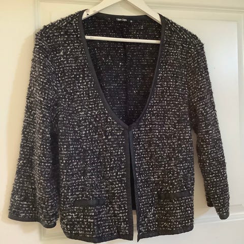 Pink og sort gardigan, har 8 sorte knapper. Har været meget lidt på.