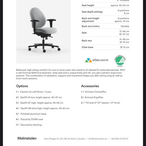 Med denne kontorstol får du optimal siddekomfort, og kroppen balanceres i din foretrukne position. Stolen er godkendt til 24-timers brug.