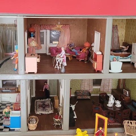 Trædukkehus med to etager og flere rum, leveres med diverse små møbler i forskellige stilarter og farver. Dukkehuset har ben og en åben bagside for adgang til indretningen. Møblerne inkluderer sofaer, stole, borde og andre miniaturehusholdningsgenstande.