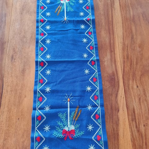 2 næsten ens bordløbere med motiver af bla. julestjerner, broderet i korssting , kantet og sømmet op. Meget fint håndværk