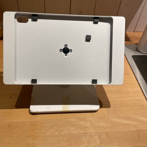 iPad-holder til væg med en fin sølvkant omkring. Det ser flot ud på væg, hvor du kan styre ex. musikken med mere, fremfor den ligger på bordet.