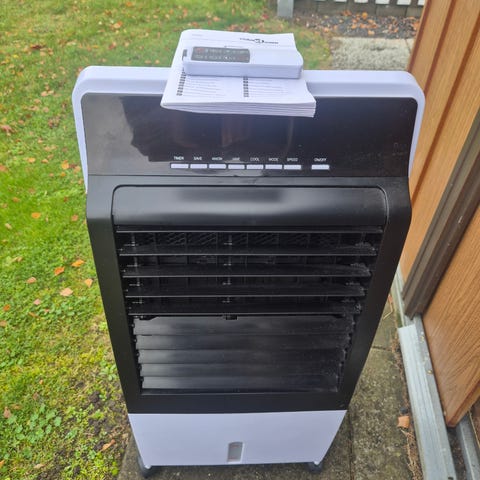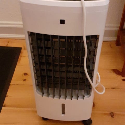 Har hjul under for nem transport, og kan tilsættes is i vandbeholder for at opnå endnu mere køling af rummet.