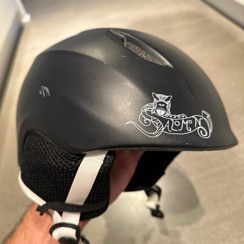 Sort Salomon Børne Skihjelm. Aldrig været i uheld eller blevet smidt med. Brugt i én vinter sæson af i alt 3 uger på ski. Lugter ikke af skummelt hår eller sved. Ingen defekter.