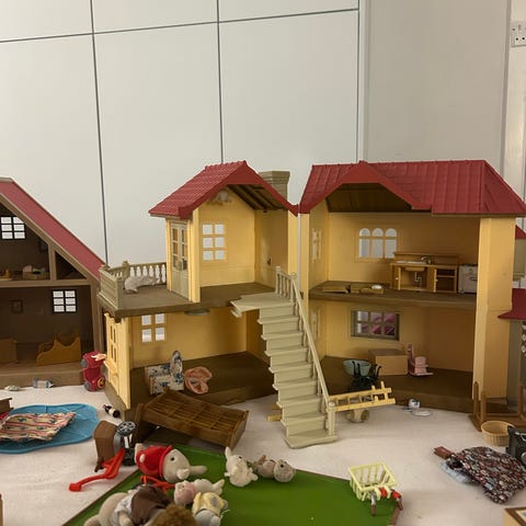 Indkøbscenter, træhus, hus, tøjbutik, campingvogn, sminkebord, snescooter
