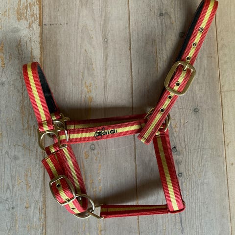 Flot sæt i grå læder og lyserød/grå stribet web, aldrig brugt - helt nyt, grime er justerbare i nakken og omkring mulen.