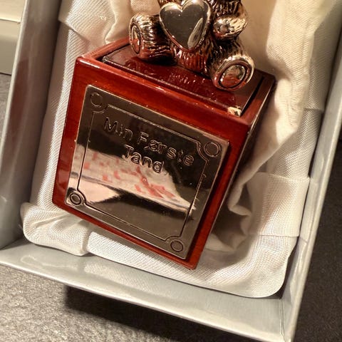 Velholdt smykkeskrin med bamse på toppen sælges. Der er blåt plus inden i. Ej sølv.