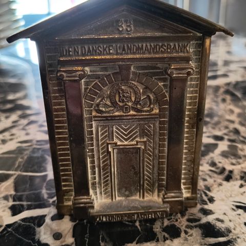 Sparebøsse fra Livsforsikringsselskabet Danmark med den midterste del af facaden på selskabets ejendom, Niels Brocks Gade 1, 1574 København K, hvor selskabet havde sit daværende hovedsæde. H. 13 cm. Bunden 8,3 x 7,2 cm