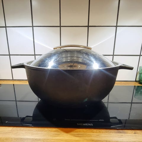 Eva Solo gryde i sort støbejern med to håndtag. Gryden har en rund form og er egnet til madlavning på komfur. Materialet sikrer jævn varmefordeling og holdbarhed.