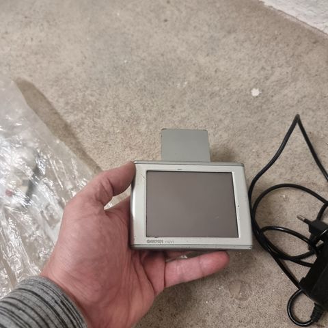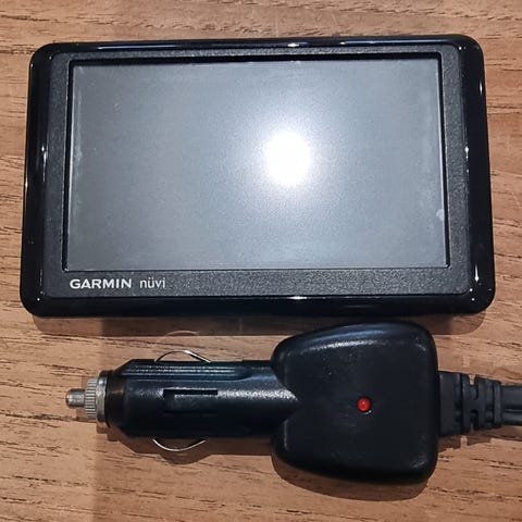 Garmin GPS-enhed med tilhørende biloplader. Enheden har en skærm til navigation og leveres med kabel til strømforsyning i bilen.