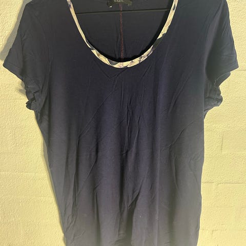 Paul Smith T-shirt i farven sort med en kulørt afslutning på halsåbningen i silke. T-shirten er i størrelse XL med et brystmål på cirka 98 cm og en længde på cirka 62 cm. T-shirten er med meget kort ærme og bemærk i øvrigt detaljen med en lille markering midt på ryggen se billede 2. T-shirten er fremstillet af 100% modal.