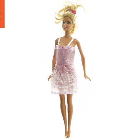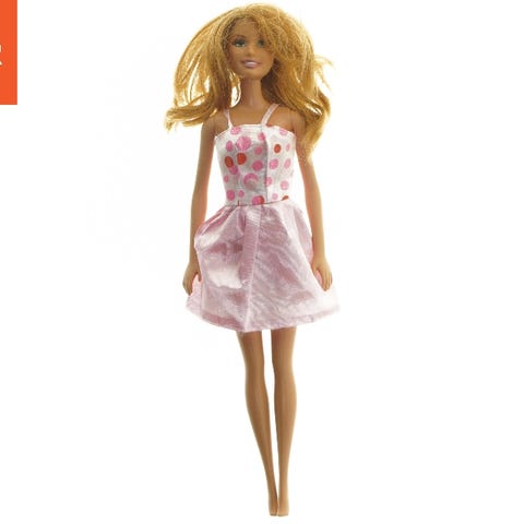 Dukken er iført en farverig badedragt med lyseblå og lyserøde nuancer. Den har langt blond hår og en slank kropsform. Den er 30 cm høj og består hovedsageligt af plastmateriale.