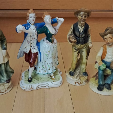 Porcelænsfigurer med historiske kostumer, håndmalet porcelæn med detaljer i blå, guld og cremefarver. Figurerne forestiller personer i forskellige positurer og tøjstile fra tidligere århundreder, herunder en dame med vifte, en violinist, en kvinde med hat og paraply, samt andre karakterer. Egnet til samling eller dekoration.
