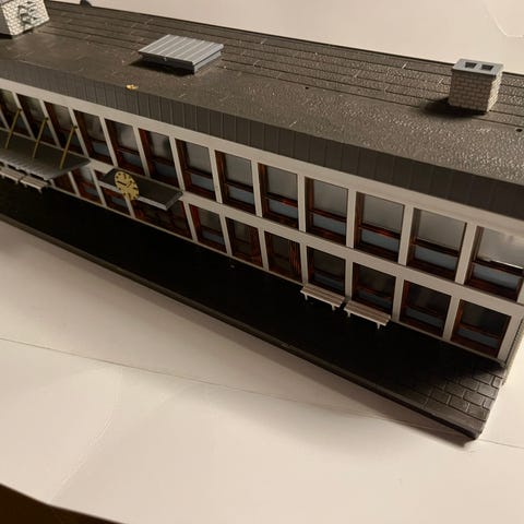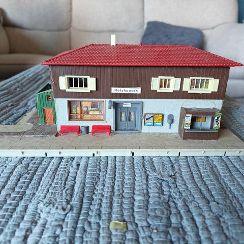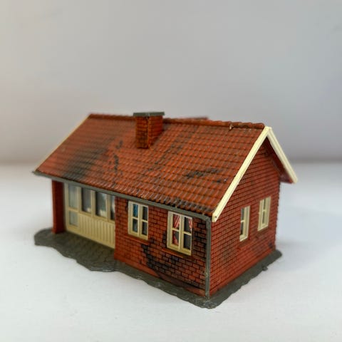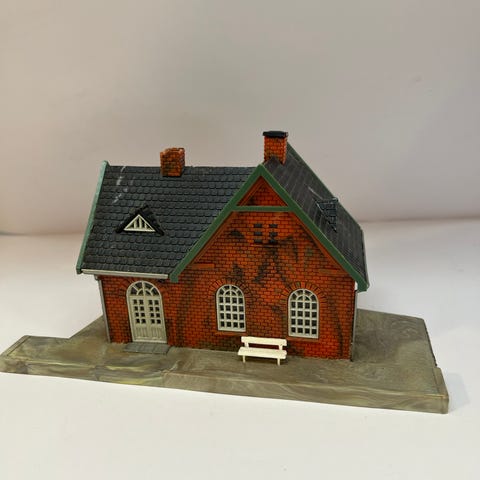 Stations bygning i str. H0 med rødt murværk og sort tag. Bygningen har flere vinduer, to skorsten og en tilstødende glasindgang.