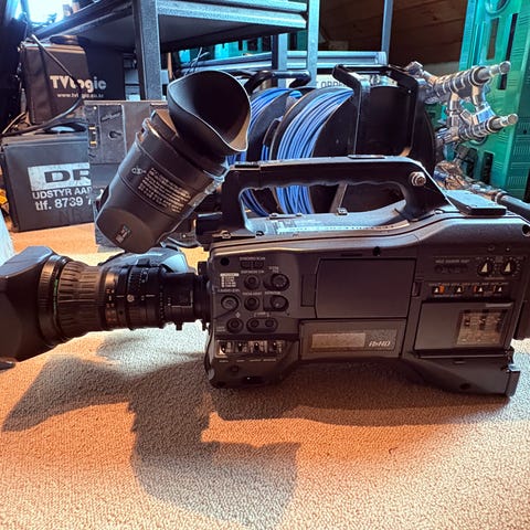 Panasonic AJ-HPX-2100E professionelt videokamera med HD-opløsning. Kameraet har avancerede funktioner til optagelse og liveproduktion, egnet til broadcast og professionelle filmoptagelser. Udstyret med håndtag, søger og flere kontrolmuligheder til præcis betjening. Farve: Sort. Materiale: Robust kamerahus designet til professionel brug.