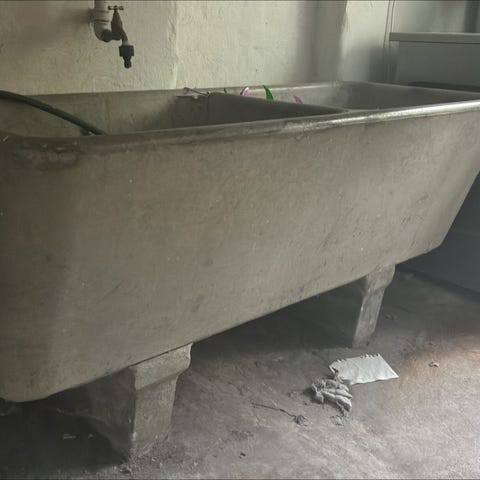 Emaljeret vaskekar med træramme, måler cirka 60 cm i længden og 50 cm i bredden. Vaskekaret er hvidt med en naturlig træramme langs kanten. Det har en afløbshul i bunden og fire monteringshuller på siderne. Velegnet til installation i bryggers eller vaskerum.