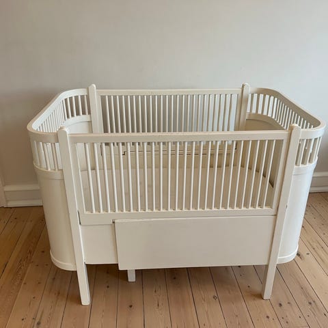 Sengen fremgår med synlige brugsspor og er malet i hvid.
