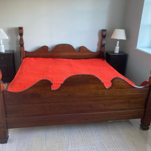 Flot og stabil dobbeltseng i klassisk design med sort smedejernsgavl med dekorative detaljer. Sengen har en robust metalramme og lamelbund i bøgetræ, der giver god støtte og ventilation til madrassen.