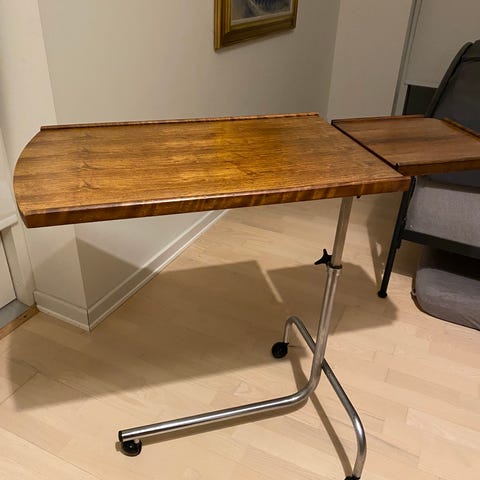 Stel i stålbøjler med kuglegreb i bakelit. Bordpladen kan hæves fra minimum 60 til maksimum 80 cm og pladen kan skråtstilles. Bøjlekonstruktionen bevirker, at bordpladen kan anvendes over seng, til læsning eller servering.