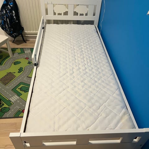 IKEA Juniorseng i metal, designet til børn. Sengen har en robust metalramme med dekorative elementer på siderne. Egnet til børn, der har brug for en juniorseng i et holdbart materiale. Inkl. madras.