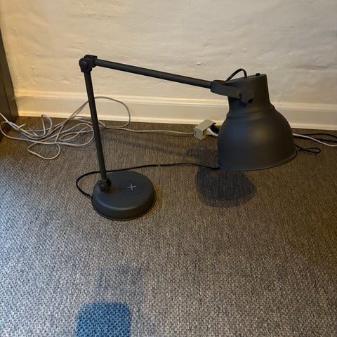 IKEA HEKTAR gulvlampe i sort farve. Lampen har en justerbar arm og rund lampefod. Den er designet til at give rettet lys og passer til en standard pære. Materialet er metal, og lampen har en moderne industriel stil. Der er indbygget wireless opladning i foden af lampen, så du aldrig løber tør for strøm🤗