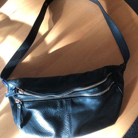 skuldertaske i sort stof til unisex brug. Tasken har flere rum med lynlås og justerbar skulderrem, egnet til daglig brug og transport af personlige ejendele.