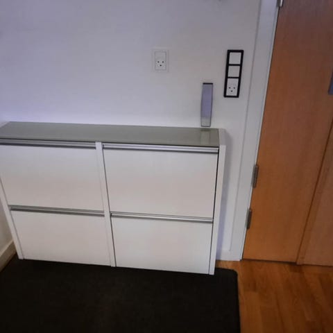 skoskab med skydedøre. Skabet er udført i træ med sorte skydedøre og metalhåndtag. Indeholder hylder til opbevaring af sko eller andre ting til entré eller opbevaring af fodtøj.