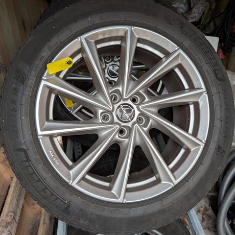 Dæk og fælge købt i sommeren 2023 og har kun kørt ca 15.000km så der er masser af kilometer tilbage.