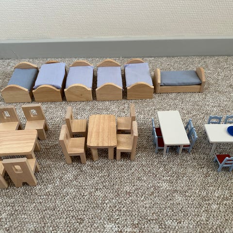Dukkehusmøbler møbler sæt bestående af en sofa med blomsterprintet stofbetræk, et lille træskab med skuffer og låge, vase og billede af familiens kat samt et lille sofabord i træ med broderet dug,Møblerne er lavet af træ og stof og er velegnede til dukkehuse eller Nissebo sælges samlet pris 75 kr jeg sender køber betaler fragt