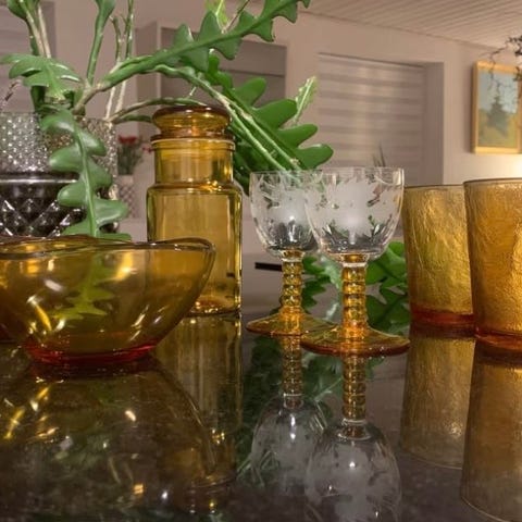 vintage glas sæt bestående af 6 cocktailglas. Glassene har en kombination af røde og gennemsigtige detaljer med dekorative elementer. Hvert glas har en bred kant og en dekorativ stilk med gyldne accenter. Egnet til servering af cocktails eller andre drikkevarer.