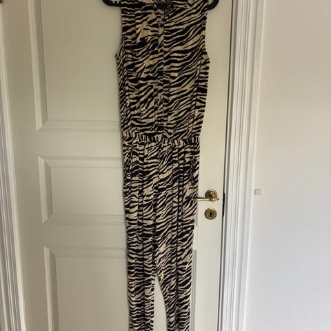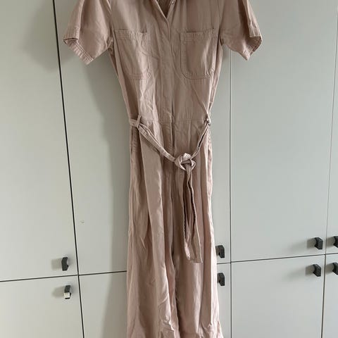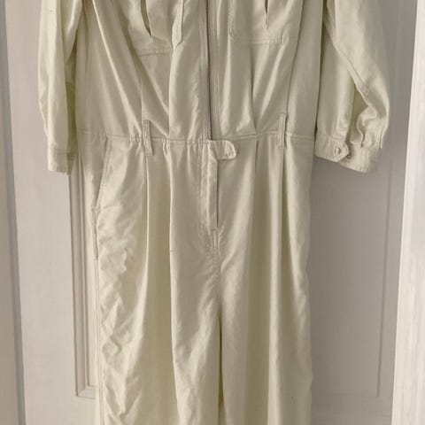Ny buksedragt i off white med brystlommer, skrålommer og lang lynlås foran. Lille skjortekrave. Tryklåslukning ved ærme. Materiale i hør og bomuld.