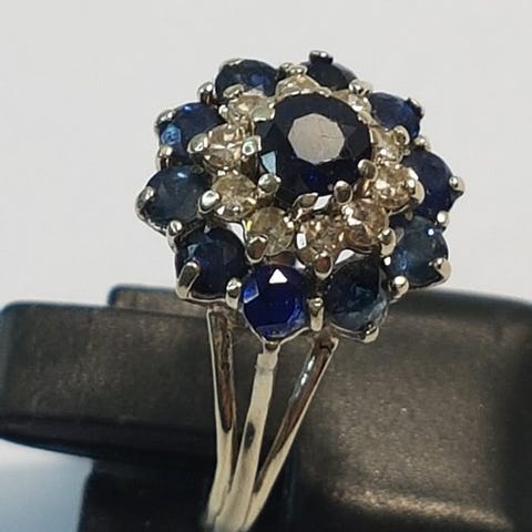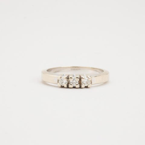 14 kt. hvidguldsring med ”stjernedrys” af 5 små brillant slebne diamanter. Vægt ca. 10 g. Ringstørrelse ca. 53. Stemplet 585 EG 14 kt. (guldsmed Erik Graugaard)