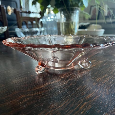 Fin ældre lille skål i presset glas - turkis/lyseblå - diameter ca. 12 cm., plansleben bund, fremstår i pæn brugt stand uden skår eller afslag.