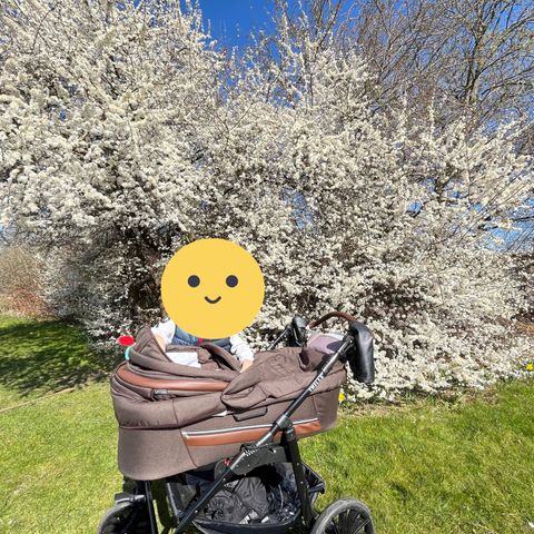 Denne skønne barnevogn, kommer med kopholder, regnslag og myggenet. Samt har den også en klapvogn del, som der endnu ikke har været i brug.