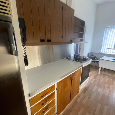 Måler ca. 195 cm ( del med vask) og ca. 235 cm (del med højskab)