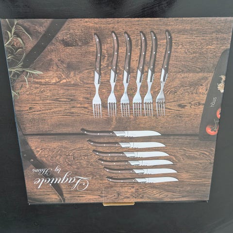 Steakbestik og forskæresæt i rustfrit stål og oliventræ, fra Laguiole by hâws.