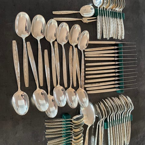 Bestiksæt bestående af flere dele, herunder knive, gafler, skeer, kagegafler og teskeer. Sættet er i plet, og skal derfor pudses