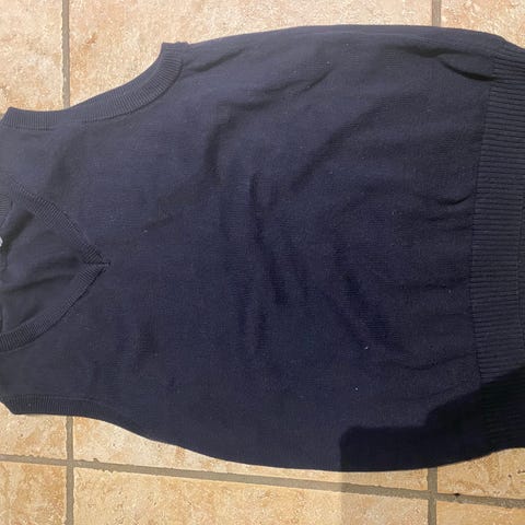 Strik vest i blå str xs fra H&M. Vores datter er 170 cm og har brugt den. Stor i størrelse.
