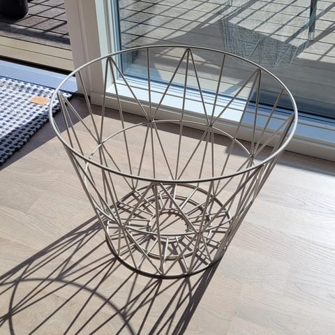 Gul Wire Basket i størrelse medium fra Ferm Living. Den er 40 cm høj og har en diameter på 50 cm øverst og 33 cm i bunden. Kommer fra røgfrit hjem.